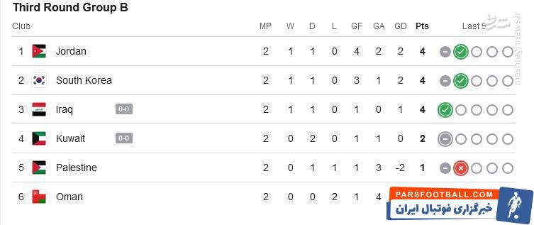اردن که در بازی نخست در زمین خود مقابل کویت متوقف شده بود نیز با نتیجه ۳-۱ فلسطین را شکست داده و به صدر جدول رفت؛ دیدار تیم های عراق و کویت در شرایطی که عراق از دقیقه ۷ با اخراج یک بازیکن خود ۱۰ نفره شده در حال انجام است.