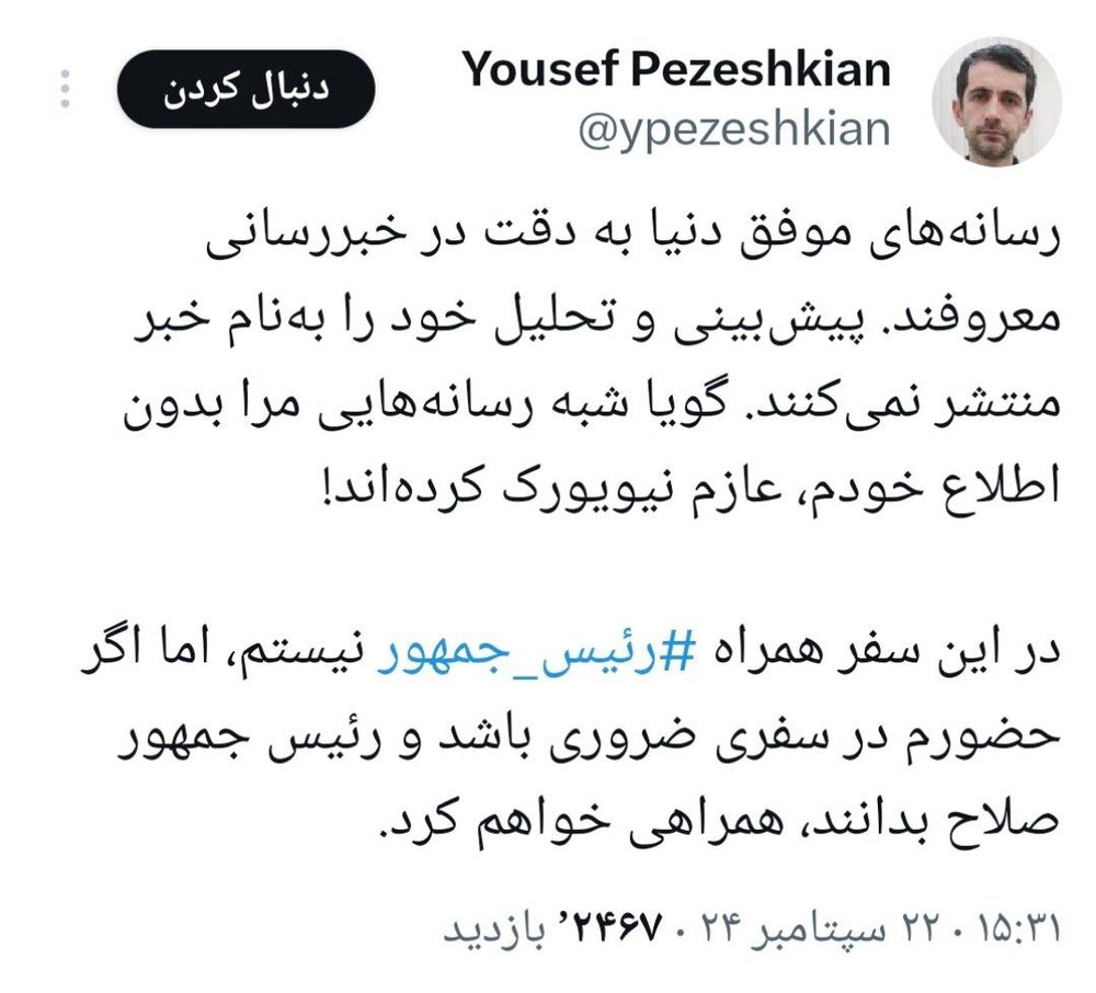 به گزارش سلام نو، متن پیام یوسف پزشکیان فرزند مسعود پزشکیان رئیس جمهور در شبکه اجتماعی ایکس به شرح زیر است: