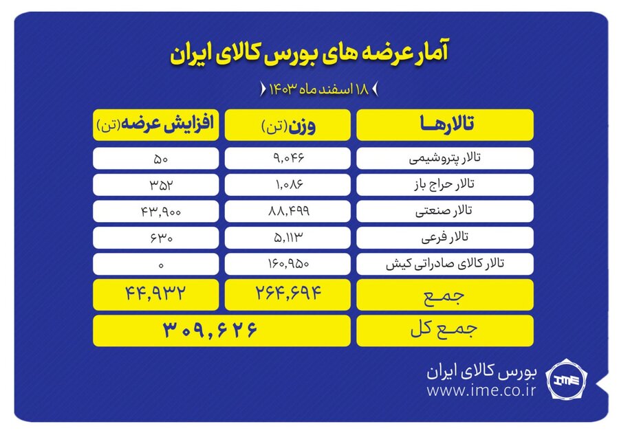 فصل اقتصاد – تالارهای بورس کالای ایران در نخستین روز هفته (شنبه 18 اسفندماه) میزبان عرضه 309 هزار و 626 تن انواع کالا و محصول است.