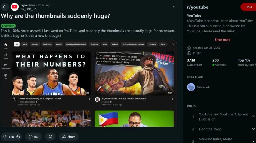 اگر اخیراً صفحه اصلی یوتیوبتان شبیه یک رابط کاربری مخصوص کودکان یا تلویزیونهای هوشمند به نظر میرسد، نگران نباشید زیرا بسیاری از کاربران نیز با این مسئله روبرو هستند. تعدادی از کاربران گزارش دادهاند که تصویر تامبنیل ویدئوها در نسخه دسکتاپ بهطور محسوسی بزرگتر شده و در هر ردیف تعداد کمتری ویدئو نمایش داده میشود. در مجموع، طراحی جدید حالتی بزرگنمایی شده یا زومشده دارد.