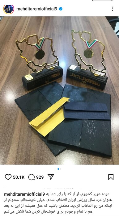 مردم عزیز کشورم، از اینکه با رای شما به عنوان مرد سال ورزش ایران انتخاب شدم، خیلی خوشحالم. ممنونم از اینکه من رو انتخاب کردید. مطمئن باشید که مثل همیشه از این به بعد هم با تمام وجودم برای خوشحال کردن شما تلاش میکنم.