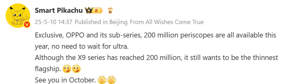 گوشی OnePlus 14 (نام احتمالی) یکی از مدلهایی خواهد بود که بیشترین بهره را از این ارتقاء خواهد برد. این با شایعات پیشین درباره ارتقاء قابلتوجه دوربین در نسل بعدی همراستا است. هنوز جزئیات دقیقی درباره OnePlus 14 منتشر نشده است. با این حال انتظار میرود که این گوشی دارای نمایشگر تخت، باتری بزرگ، و چیپست Snapdragon 8 Gen 4 Elite باشد. از طرفی گفته میشود سری Find X9 از چیپست Dimensity 9500 استفاده خواهد کرد. همچنین افشاگر گفته که در کنار دوربین ۲۰۰ مگاپیکسلی، اوپو قصد دارد طراحی باریک پرچمداران خود را حفظ کند. هر دو دستگاه قرار است در ماه اکتبر به صورت رسمی معرفی شوند.