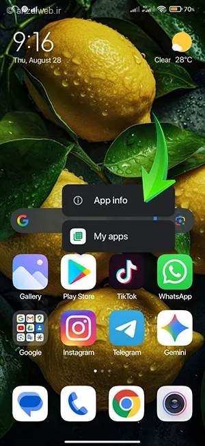 گاهی مواقع با وجود اینکه VPN خود را روشن کرده‌اید، باز هم بعد از مراجعه به گوگل پلی و جستجوی اپلیکیشن ChatGPT این برنامه برایتان نمایش داده نمی‌شود. این مشکل در اکثر موارد مربوط به قدیمی بودن کش گوگل پلی استور است و می‌توانید به راحتی آن را حل کنید. آیکن گوگل پلی استور را کمی لمس کنید و سپس با زدن گزینه App info وارد بخش تنظیمات شوید.