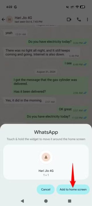 آیکون میانبر را به هر بخشی از صفحه اصلی که میخواهید بکشید یا اجازه دهید گوشی بهصورت خودکار آن را اضافه کند. از این پس، با ضربه زدن روی این میانبر، مستقیماً گفتوگو با آن شماره در واتساپ باز میشود.