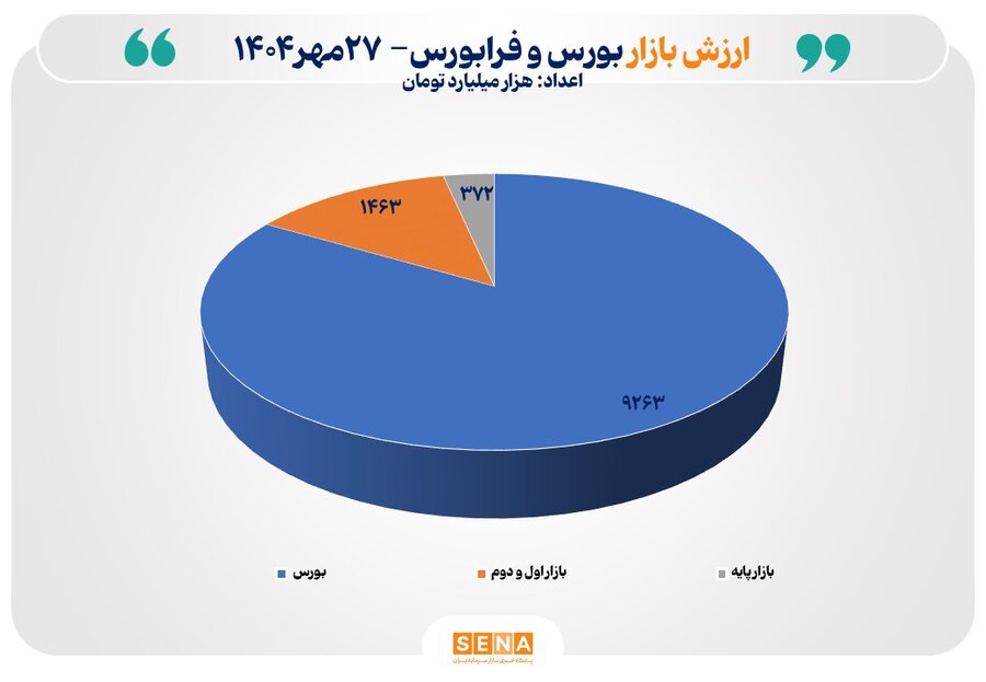 در مبادلات امروز ارزش بازار سهام بورس تهران معادل 9 هزار و 263 هزار میلیارد تومان و ارزش بازار فرابورس به همراه بازار پایه معادل یک هزار و 835 هزار میلیارد تومان بود.