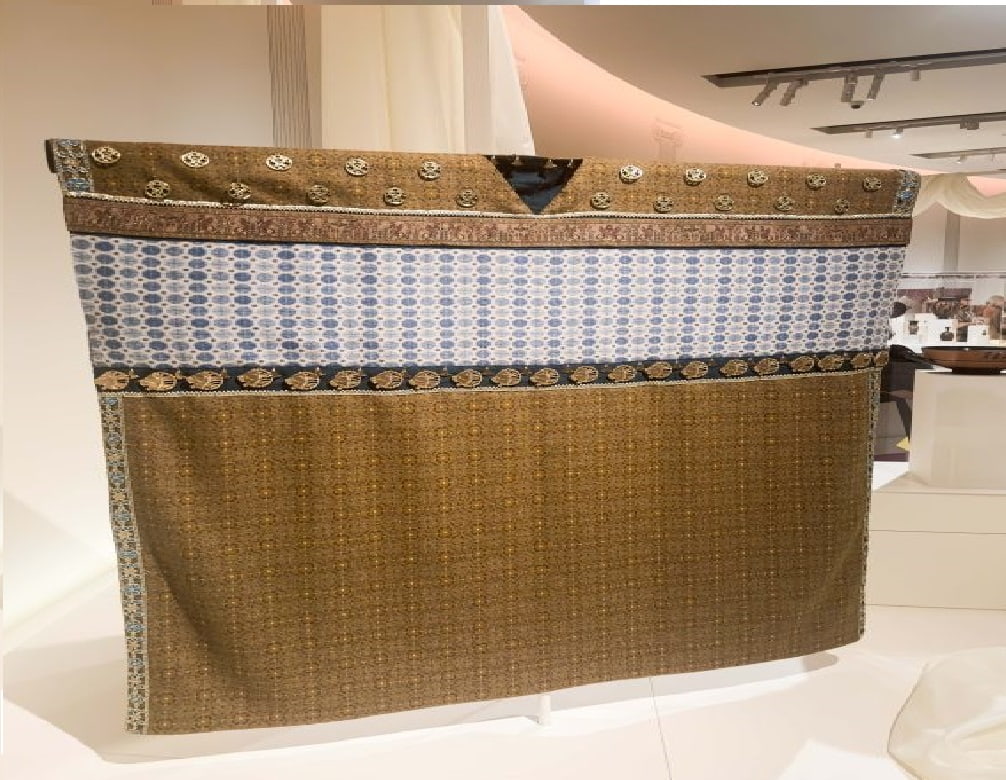 | تزئینات | نقشدوزی طلایی، اپلیکههای فلزی | استفاده در لباسهای هلنیستی |
