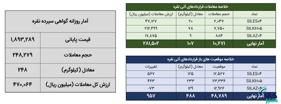 در این روز 10 هزار و 671 قرارداد آتی معادل 107 کیلوگرم شمش نقره به ارزش 28.1 میلیارد تومان منعقد شد. در پایان معاملات دیروز موقعیتهای باز قراردادهای آتی نقره معادل 488 کیلوگرم شمش نقره بود. در بازار قراردادهای آتی شاهد افزایش 957 موقعیت در مجموع موقعیتهای باز قراردادهای مبتنی بر نقره بودیم.