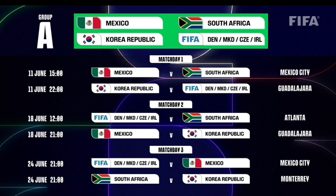 مکزیک – آفریقای جنوبی؛ ۲۱ خرداد؛ ساعت ۲۳:۳۰ (به وقت تهران) ؛ مکزیکوسیتی مکزیک (بازی افتتاحیه)