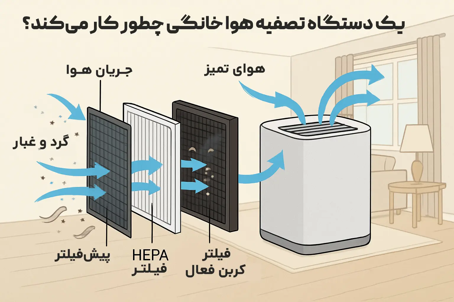 دستگاه تصفیه هوا وسیله‌ای است که با به‌کارگیری فیلترهایی مانند HEPA و کربن فعال، آلاینده‌های میکروسکوپی (مانند گردوغبار، گرده، آلرژن‌ها) و آلاینده‌های گازی (مانند بو و VOCs) را از هوای محیط حذف کرده و هوای پاک را به فضا بازمی‌گرداند.