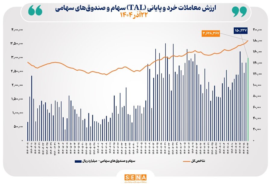 فصل اقتصاد – ارزش معاملات خرد «سهام و صندوقهای سهامی» و پایانی(TAL) در معاملات امروز شنبه 22 آذر 1404 بازار سهام از مرز 15 همت عبور کرد.