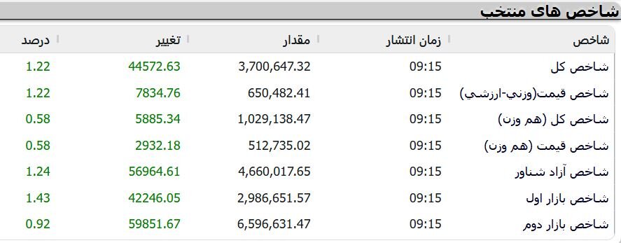 به گزارش پایگاه خبری بازار سرمایه ایران(سنا) ، شاخص کل بورس تهران در ابتدای مبادلات امروز با رشد 44 هزار واحد و 1.2 درصدی به سطح 3 میلیون و 700 هزار و 647 واحد رسید.