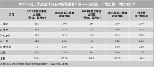 طبق گزارش IDC، هواوی (Huawei) با فروش ۲۸.۶ میلیون دستگاه و رشد ۲۱.۶ درصدی، در سه ماهه اول تا سوم ۲۰۲۵ در بازار ساعت‌های هوشمند جهانی اول شد. شیائومی (Xiaomi) نیز با ۲۷.۹ میلیون دستگاه و رشد چشمگیر ۳۶.۱ درصدی، جایگاه دوم را کسب کرد.