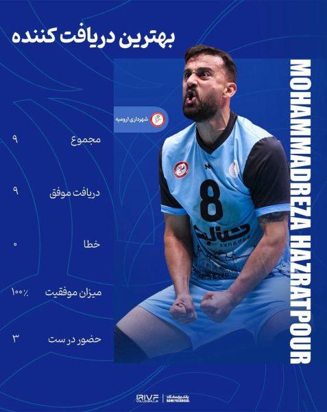 محمدرضا حضرتپور، لیبروی ملیپوش شهرداری ارومیه، یکی از چهرههای برجسته این دیدار بود. او که در آغاز فصل فاصلهای با فرم ایدهآل خود داشت، در این مسابقه با ثبت ۹ دریافت موفق از ۹ تلاش، آماری کمنظیر به جا گذاشت و نشان داد به روزهای اوج خود بازگشته است. عملکرد مطمئن او نقش مهمی در آرامش تیم و شکلگیری این برد قاطع ایفا کرد.